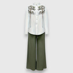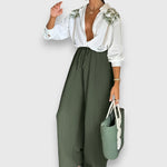 Sada Nivana kombinuje elegantnú blúzu s jemným kvetinovým vzorom a splývavé nohavice so širokými nohavicami – ideálne pre štýlové dni. Ľahký materiál a vysoký golier dodávajú celku ženský a náročný nádych.