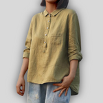 Klasická ľanová blúza, ktorá vyžaruje diskrétnu eleganciu a každodenné pohodlie. Má klasický golier s gombíkmi vpredu a praktickú kapsu na hrudi. Uvoľnený strih a dlhé rukávy s možnosťou ohrnutia ju robia ideálnou pre všetky hodiny dňa.