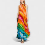 Urobte dojem s šatami Iris s volánmi, ktoré očarujú svojimi kaskádovými volánmi a živým batikovaným potlačou, vyrobené z jemného georgette krepu pre luxusný pocit.