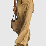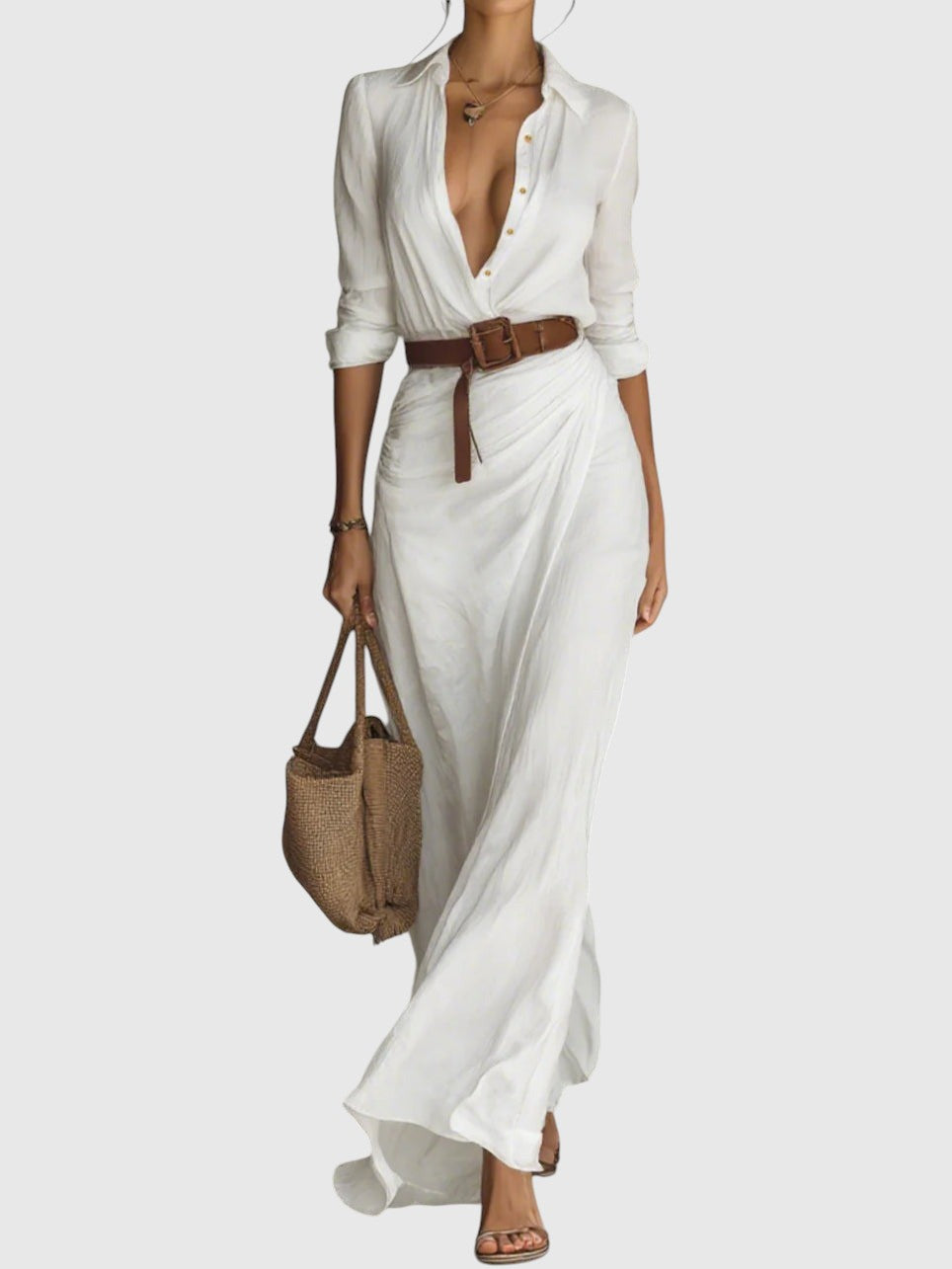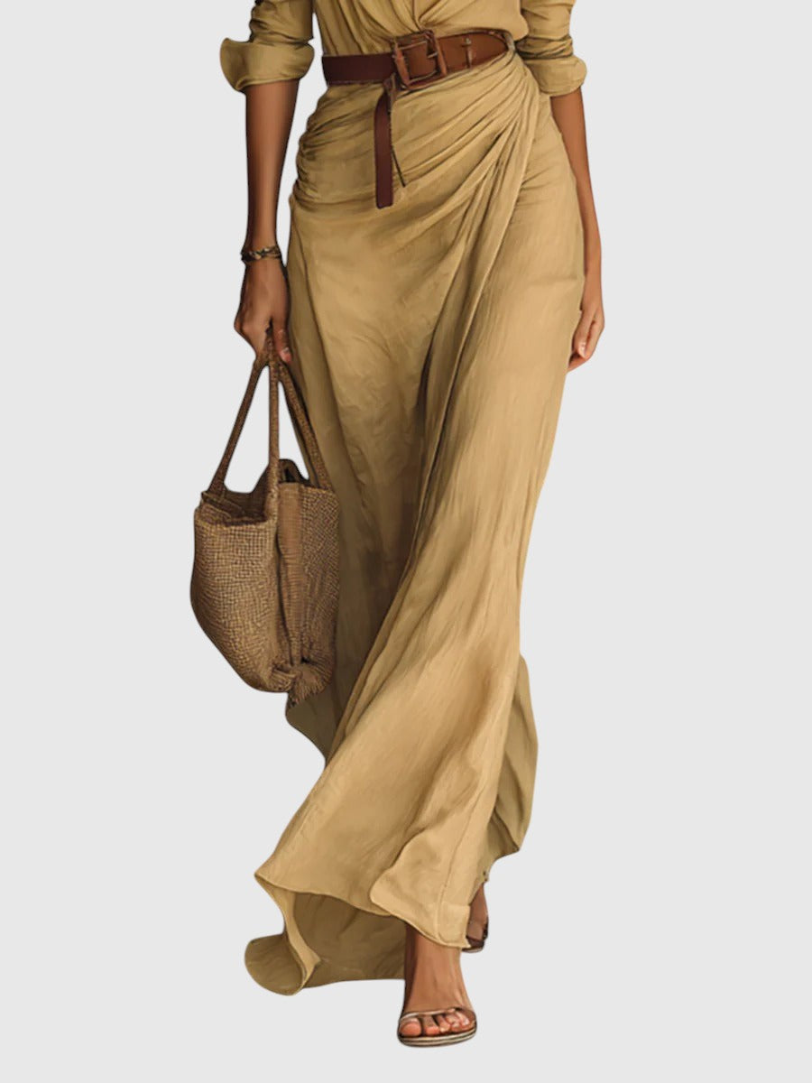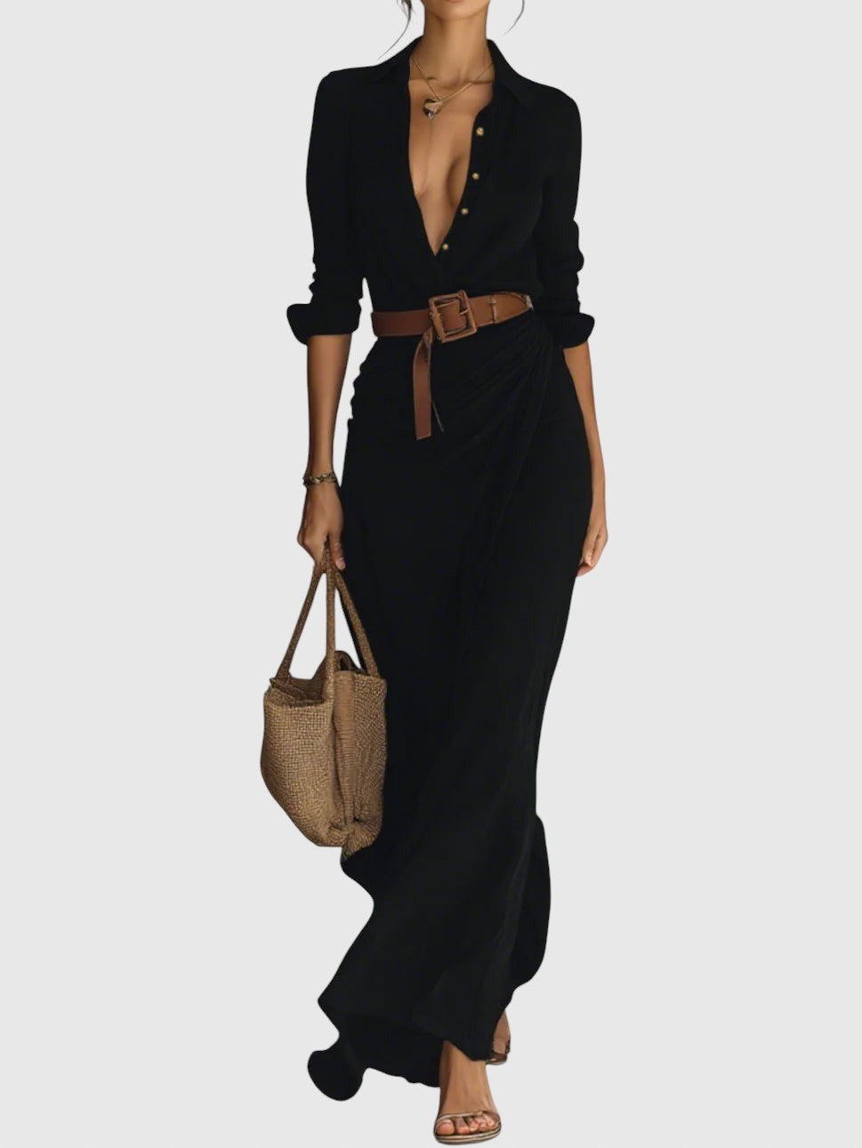 Dlhé šaty sofistikovaného dizajnu, vyrobené z ľahkej a splývavej tkaniny, ktorá zabezpečuje prirodzený pohyb a dokonalý strih. Majú hlboký výstrih do „V“, ktorý zvýrazňuje dekolt, dlhé rukávy s manžetami a zavinovací detail na sukni, ktorý vytvára ženský a pôsobivý vzhľad. Súčasťou je opasok, ktorý zvýrazní pás a podtrhne siluetu. Ideálna voľba ako pre voľný čas, tak aj pre špeciálne príležitosti.