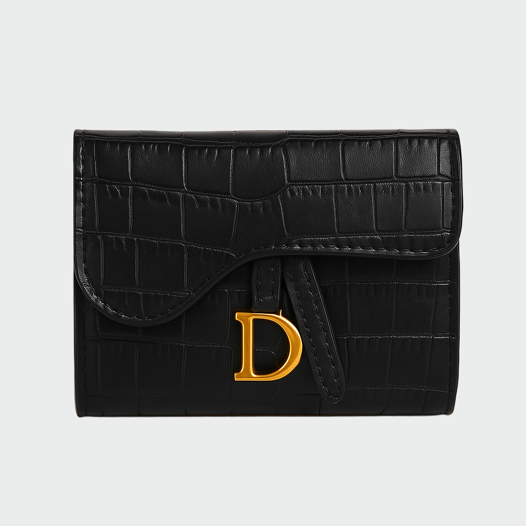 Elegantná peňaženka v čiernej farbe s reliéfnou textúrou, ktorá pripomína krokodíliu kožu. Moderný dizajn je doplnený charakteristickým kovovým zapínaním v zlatej farbe, čo dodáva pocit luxusu a štýlu. Disponuje praktickým vnútorným usporiadaním pre bezpečnú organizáciu kariet, hotovosti a drobných predmetov. Doplnok, ktorý spája pohodlie, praktickosť a eleganciu, ideálny pre každú príležitosť.